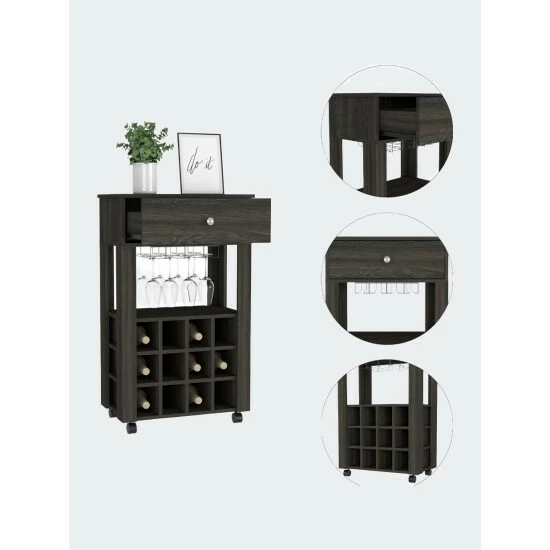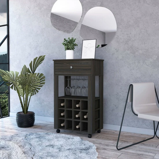 If you enjoy wine and want a contemporary setting in which to store your favorite bottles and glasses, this bar has both. It includes twelve compartments(4”W X 4,7”H) for keeping your wine organized and fresh, as well as the capacity to store your glasses, as well as a huge drawer and caster wheels (2,2”)for improved movement and adaptability.