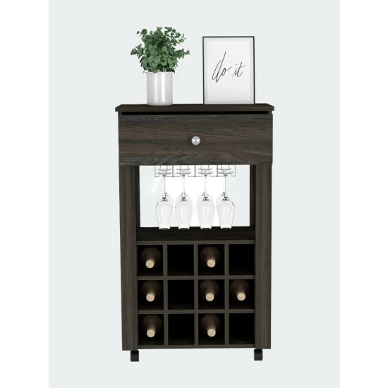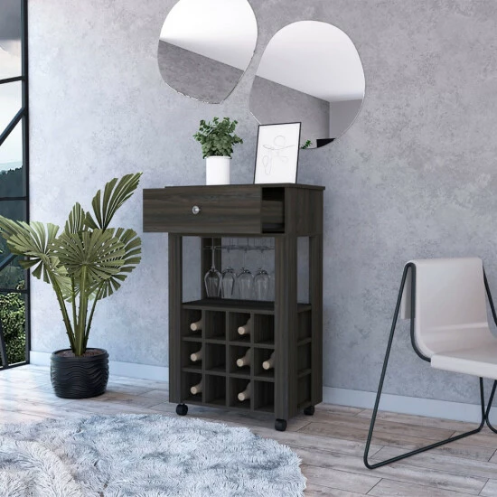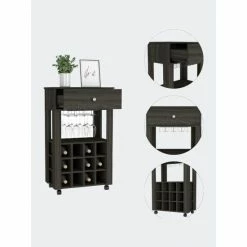 Ace Bar Cart, If you enjoy wine and want a contemporary setting in which to store your favorite bottles and glasses, this bar has both. It includes twelve compartments(4”W X 4,7”H) for keeping your wine organized and fresh, as well as the capacity to store your glasses, as well as a huge drawer and caster (2,2”)for improved movement and adaptability. Designed with elegant light grey, black wengue, and carbon espresso manufactured wood finish.
