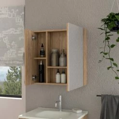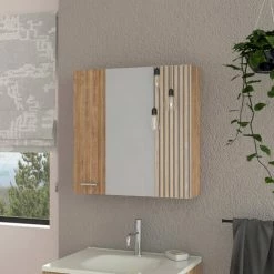 Aria Mirrored Medicine Cabinet, looking for more storage and a gorgeous mirror to help you get ready each day? Check out the Aria Mirrored Medicine Cabinet! This sleek and modern cabinet has a single Mirrored door (15,1″H X 15,8″W) with interior shelves, perfect for holding all your bathroom essentials. Whether remodeling your bathroom or just looking for a stylish and functional addition, the Aria Mirrored Medicine Cabinet is a great option! Designed with elegant pine manufactured wood finish.