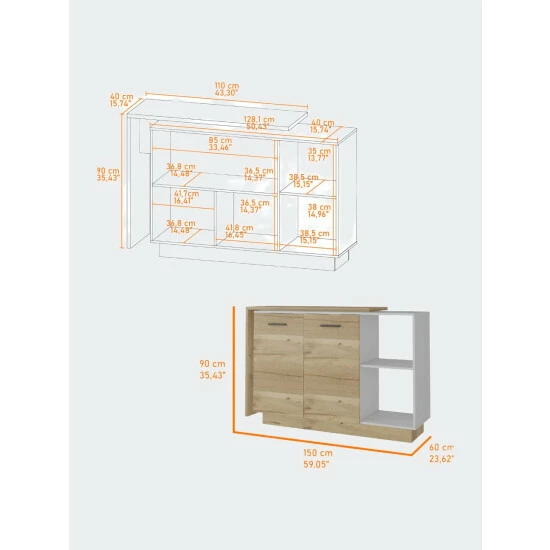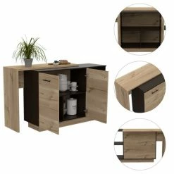 The Aspen Kitchen Island and you are a perfect match. Starting with its size will give you that extra space you were looking for without getting in the way. It features a modern and elegant design with surface and color combinations, Perfect as an auxiliary dining table, with two open shelves to display décor and three internal shelves for more oversized items each shelf is 14.3″ height x 15″ depth. Designed with elegant Black Wengue / Light Oak, White manufactured wood finish.