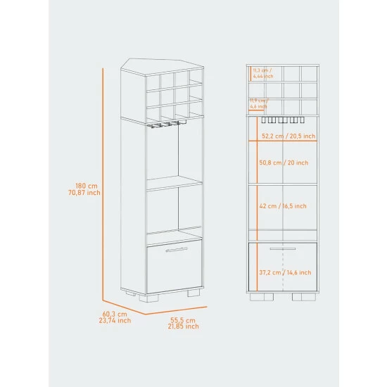 - Dimensions: 70.87″ H x 21.85″ W x 23.74″ D