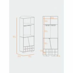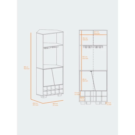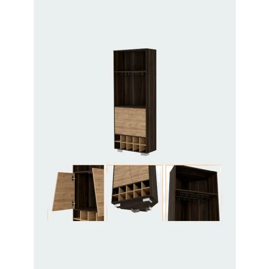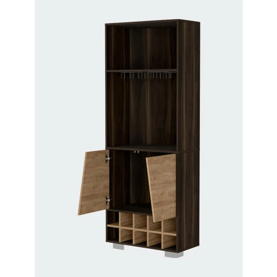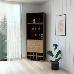 Bahamas Corner Bar, Step up your furniture game with this exquisite corner bar cabinet. With ten wine cubbies (4,4″, H x 4,6″W) two shelves (13,8″H x 25,8″W x 23,5″H), a two-door cabinet (18,8″H), and a rack for cups, you’ll have plenty of storage capacity for all your drinks and accessories. The contemporary style is sure to complement any decor. At the same time, the elegance ensures that this piece will be a focal point in any room. Designed with elegant dark oak-pine manufactured wood finish.