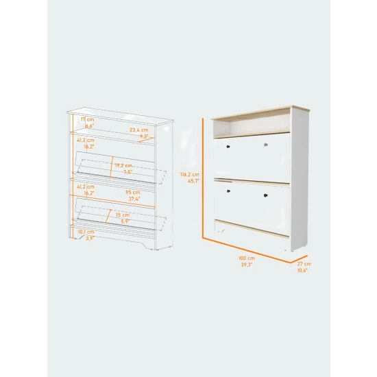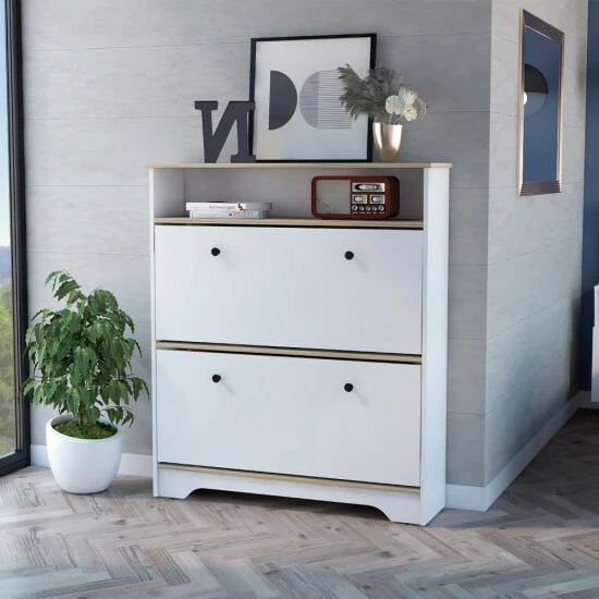 Brandford Shoe Rack, is your shoe collection taking over your room? The Brandford Shoe Rack is the perfect solution to your shoe storage woes. This innovative rack features a unique design that will take up minimal space in your room while neatly organizing all of your shoes. The rack has got you covered. With two ample shelves (37.4″ W x 15.4″ H) to hold up 12 pairs, one shelf (37.4″ W x 6.6″ H) and ample Superior Top (39.3″ W x 10.6″ D) Order yours today and say goodbye to cluttered closets! Designed with elegant dark Brown and light oak-white manufactured wood finish.