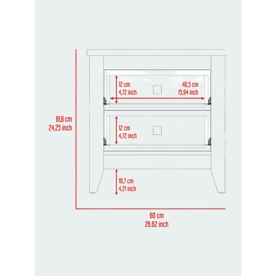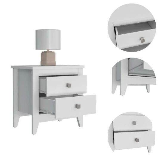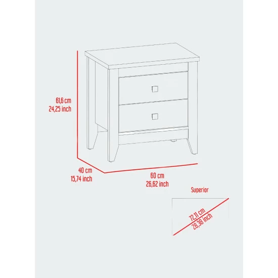 The Breeze Nightstand is fabulous for different decorating in your room, with a classic touch but without sacrificing its current style. This one-of-a-kind nightstand features a beautiful tabletop (28.38’‘) for showcasing your favorite books or decorations. It contains two spacious drawers (15.94”W X 4.72”H) for more secure and organized storage of your belongings. It also includes two metal handles for a classy look. Designed with elegant black wengue and white manufactured wood finish.