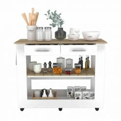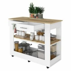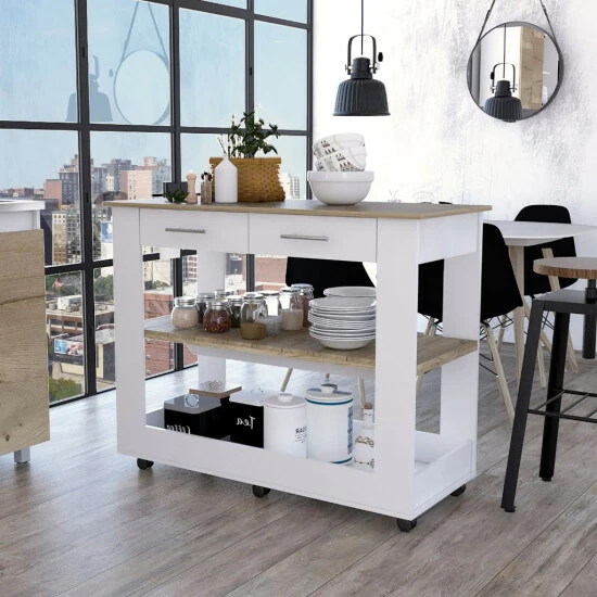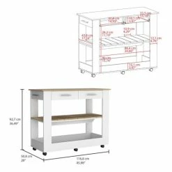 The Brooklyn 80 Kitchen Island, do you want a kitchen bar that serves to prepare food and enjoy eating with your friends, family, or partner? This product is perfect for you. It features side and front drawers, bottom and middle shelves, six wheels with a locking system, and top surface dimensions: 20″ width x 45.9″ depth. Designed with elegant Black Wengue / Light Oak, White / Light Oak manufactured wood finish.