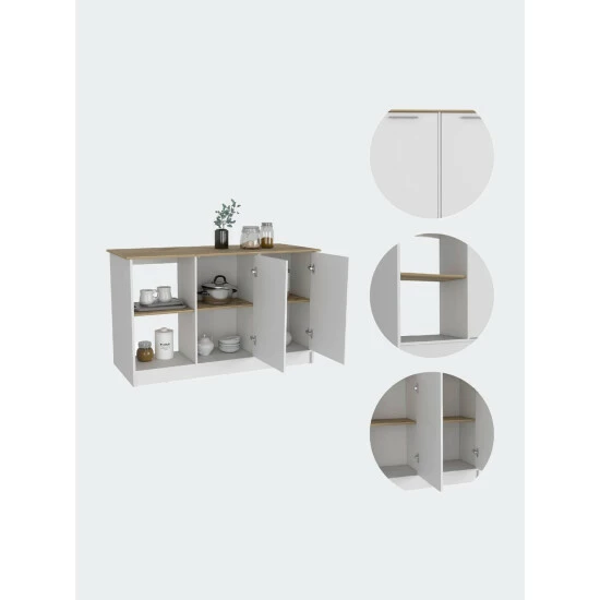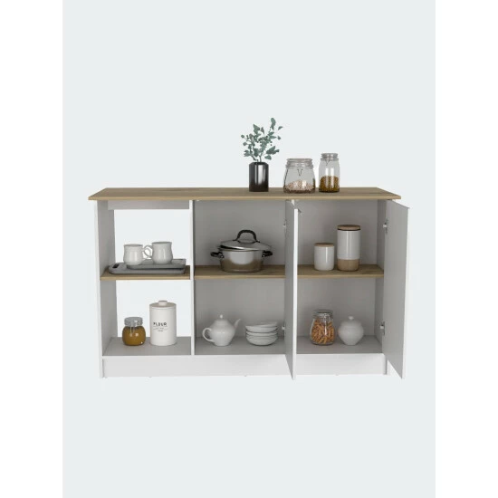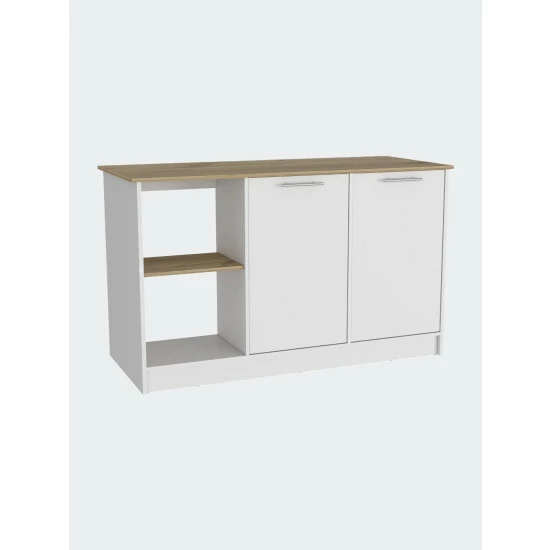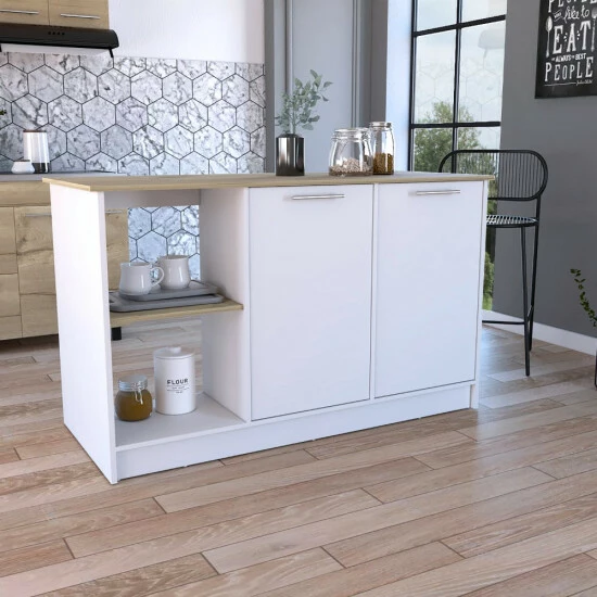 Carnation Kitchen Island, this unique kitchen island fulfills any function you want. Thanks to its great ergonomic design, created especially for daring people who seek to give more life and meaning to the interiors of their kitchens and homes. The perfect size workstation! this 59″ W x 25.19″ D top surface is a blessing when needed that extra surface space. With great features such as two cabinets with two interior shelves each, to store great kitchen essentials such as pans and pots, plus two open shelves. Designed with elegant light oak-white manufactured wood finish.