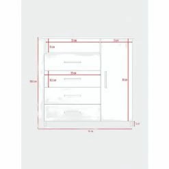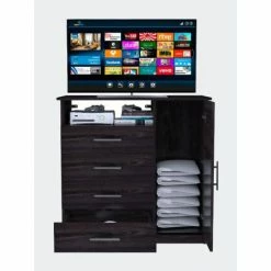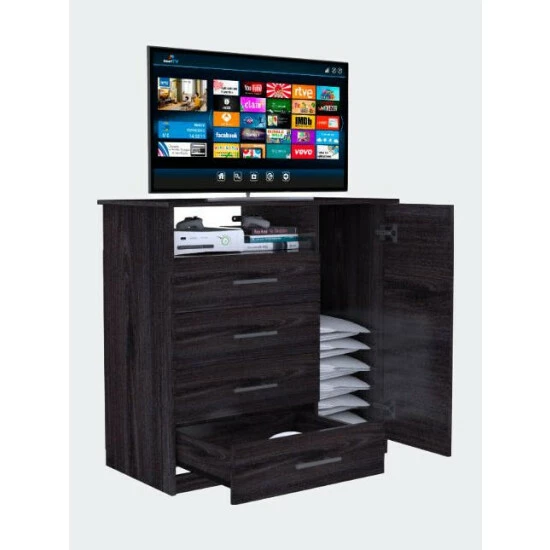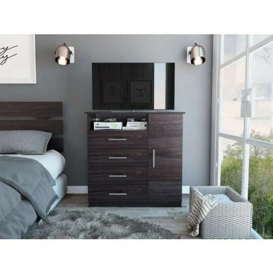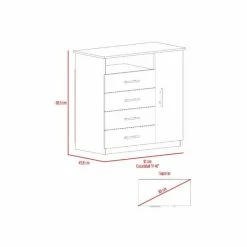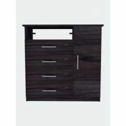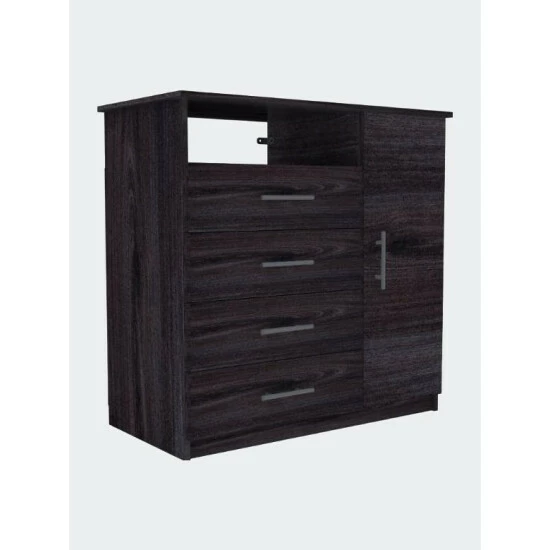 Carolina Four Drawer Dresser is a beautiful 4-drawer chest for greater efficiency when storing clothes; with this chest of drawers, you can have essential accessories on hand for daily living. Thanks to its vertical drawer, its large size allows you to keep many clothing and accessories in a few words! They have the best dresser on the market! With four drawers, a Single Door dresser, an enduring contemporary look with an elegant finish, and plenty of different storage spaces to store all types of the living room and bedroom items. The top can be used to place your TV stand (up to a 40″ Flat screen with its good to base). Designed with elegant black wengue, dark walnut, white, light oak-white, light gray and smokey oak-white manufactured wood.