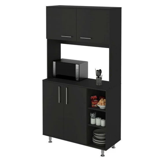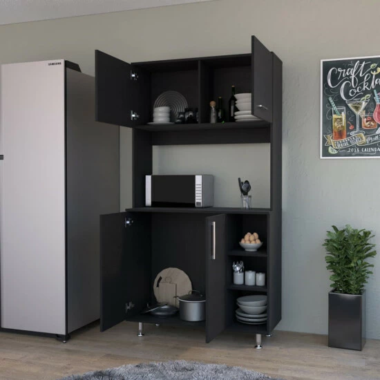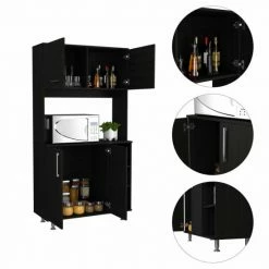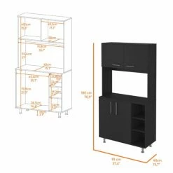 The Colorado Pantry Cabinet organization station frees up valuable counter top and cabinet space, optimizing your kitchen space and making your day-to-day life more practical. It features a bottom cabinet for big kitchen items like pots and pans, an oven rack at the bottom to store frequently used items, a hutch with two cabinets, spacious top surface (37″ wide) to place an appliance such as microwaves, air fryers, food processors or to be used as a prep meal station. Designed with elegant Black Wengue, White manufactured wood finish.