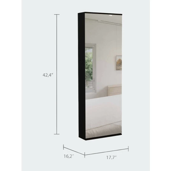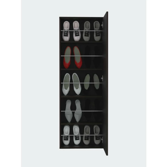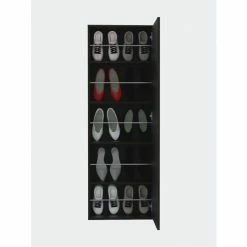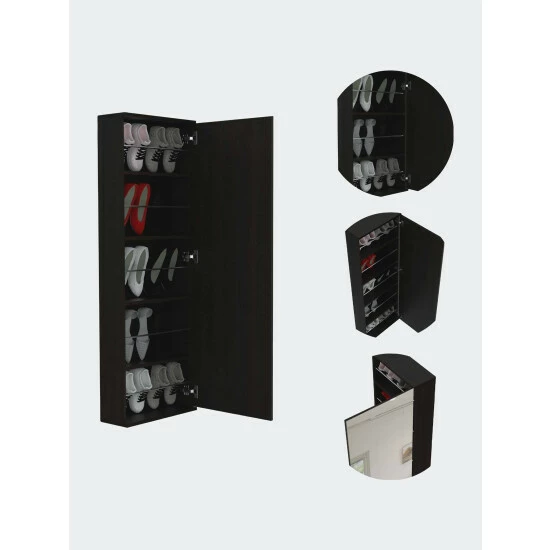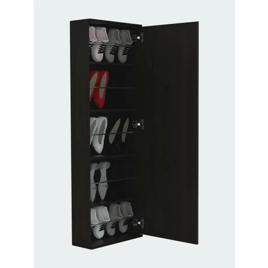 Connecticut Wall Mounted Shoe Rack w/ Mirror is designed for people who are tired of storing their shoes traditionally. Thanks to this, you can avoid stacking your boots or your family’s shoes on the door of your house, which makes it look disorganized. The Connecticut Wall Mounted Shoe Rack has a mirror door that gives it a very fancy, practical, and innovative touch; you can quickly check out your look for the day before choosing what shoes to wear with your outfit. Inside it has five shelves, each one of them can store two pairs of shoes, tennis shoes, heels or sandals. Designed with elegant light gray and black manufactured wood.