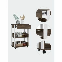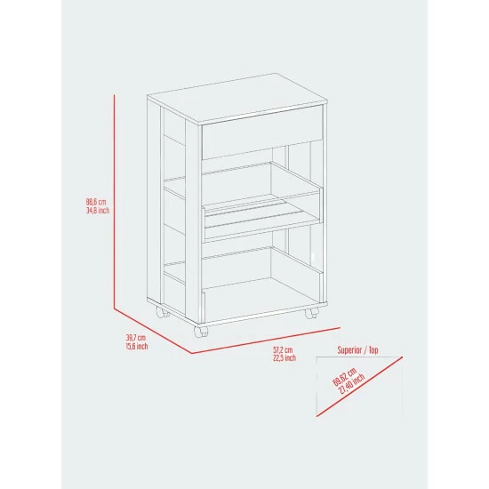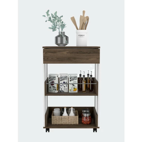 Don’t you know about an easier way to transport things from your kitchen to another place in your home? The Dundee Kitchen Car will make your life better. With this kitchen car, you will be able to host more parties in your house and make it easier to serve your guests; you just have to put the things over the car and pull it into your living room. The Dundee Kitchen Car features a countertop to place the things you want to transport, a drawer to store some of your silverware, and two open shelves for storing big items or drinks. In addition, this pantry features the best quality of hardware: a full extension drawer slide made of steel, four casters, and an aluminum tube on the upper open shelf. Designed with elegant White manufactured wood finish.