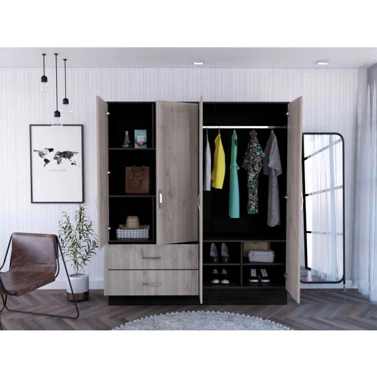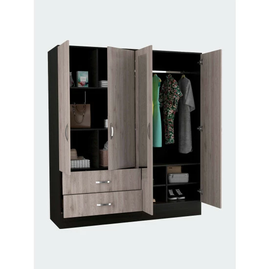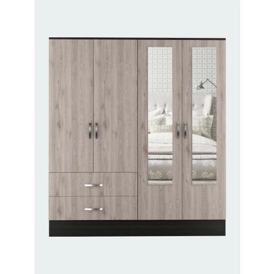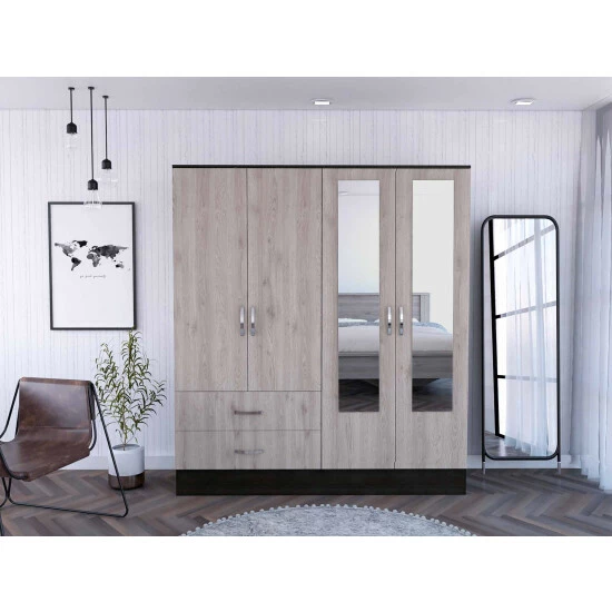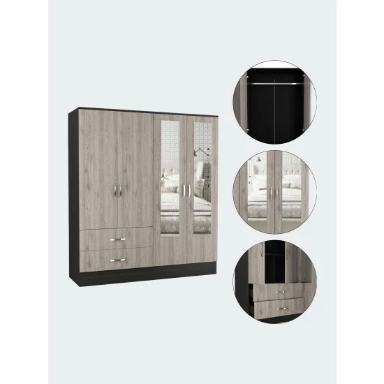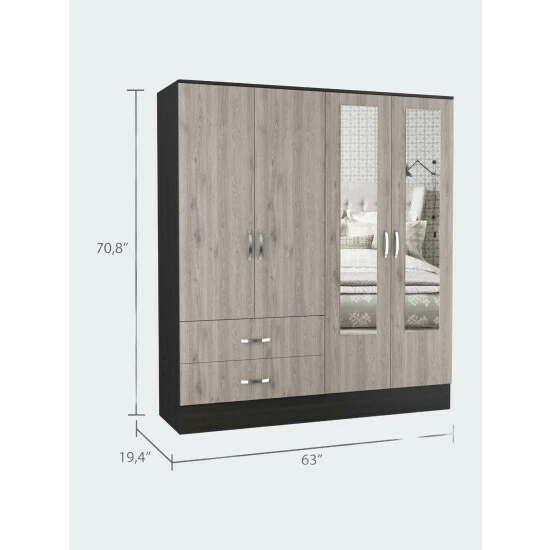 Florencia L Mirrored Armoire, manufactured wood on the inside and a modern look on the outside makes it a perfect mix! Add two 47″ high mirrors installed on each door of the cabinet install in the cabinet door will get you that effect of a more spacious room this Florencia S Armoire becomes irresistible! Need more storage? Easy to assemble with all parts and hardware numbered and separated, it might be a fun family project putting it together. The modern door pulls an excellent elegant touch to this Armoire. Two spacious, extensive drawers (30.5″ W x 5.1″ H) are perfect for your undergarments or small accessories. On the left side, on top of the drawers, a two-door cabinet with an interior hanging rod will give you plentiful space for hanging your clothes. A tall one-door cabinet conceals four shelves on the right side, great for shirts, bags, lotions, or perfumes. Designed with elegant light grey-black manufactured wood.