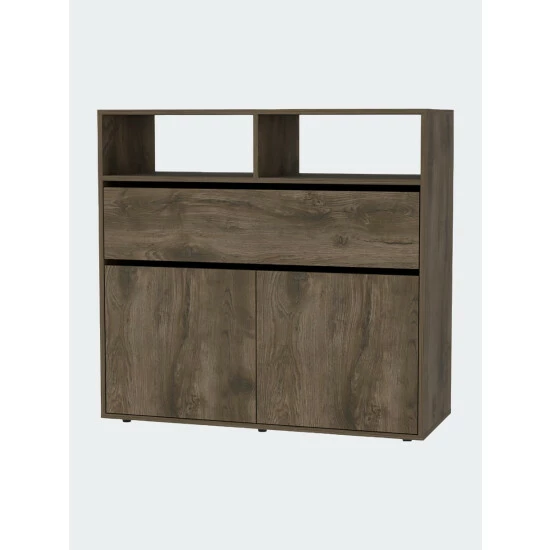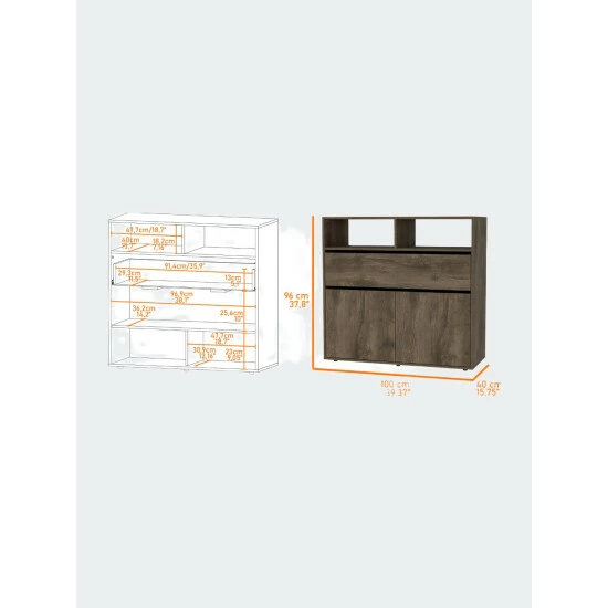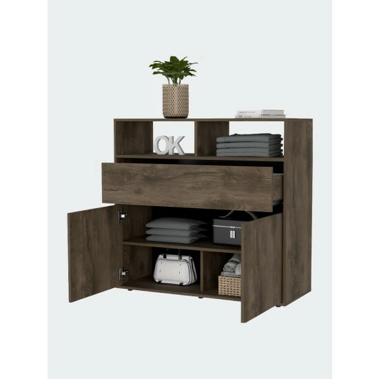 Gianna Dresser, this piece of furniture is the perfect size for any bedroom and provides ample storage for all your clothes, shoes, and accessories. It has one big drawer (5.1″ H x 11.5″ D x 35.9″ W) and a double door cabinet with interior shelves for more storage capacity. With its sleek lines and modern design, the Gianna Dresser will give any bedroom an instant style upgrade. Designed with elegant dark brown manufactured wood finish.