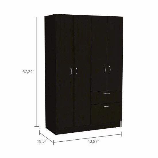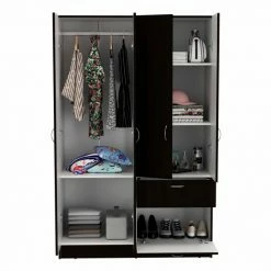 Habana Armoire, choose this Habana Armoire to match your modern & contemporary decor. its main features are: one spacious drawer at the bottom is the perfect place for smaller items that you need handy, two double door cabinets, one drawer, and one pull-down door cabinet will get the job done to create storage space, on Its right side, a beautiful two-door cabinet 38″ high opens up to three interiors, very spacious shelves, perfect for bags, folded shirts, pants, or shoes, and a small pull-down door at the bottom opens up cabinet space for you. Designed with elegant black-white manufactured wood finish.