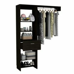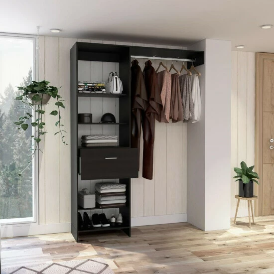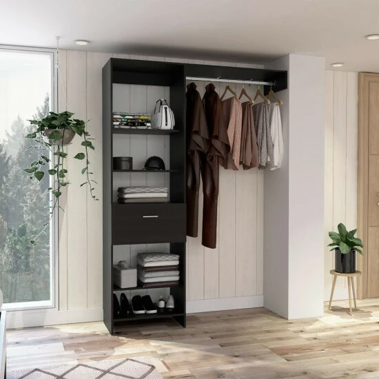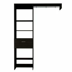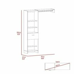 Hybrid Closet System, They frequently want additional storage space in the rooms but cannot do so due to a lack of space; In this instance, this creative and different closet is a great option. It adjusts to every area of the room and its distinctive design will give your room a one-of-a-kind feel. You can store your favorite clothing with its ingenious system, which has five shelf applications, a drawer (20.1”W x 14.1”H) and a metal rod (35.5”) to keep your favorite items better organized , Superior-top size (155.6”).
