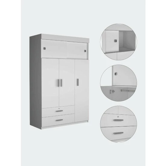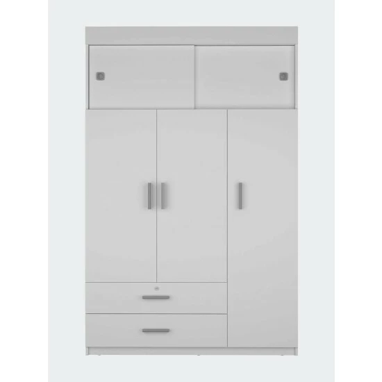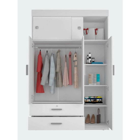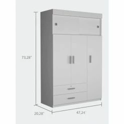 The Jakarta armoire is a functional and sturdy piece. Standing at 73″ high, this armoire has outstanding features with all the functionality and storage space you need for your space. Providing Two spacious, extensive drawers (28.5″ W x 4.4″H) are perfect for your small things also has on the right side, a tall one-door cabinet conceals four shelves, on the left side, on top of the drawers, a double-door cabinet with an interior hanging rod will give you plentiful space for hanging your clothes, and finally, at the top of this armoire, you will get a vast space cabinet (47″ W x 14.5 H) with two sliding doors for easy access to your items. Designed with elegant white manufactured wood finish.