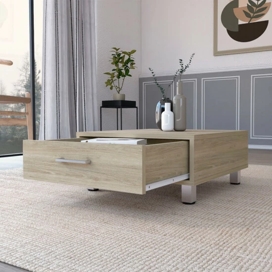 The Kabul coffee table, made of elegant Light pine particleboard is the perfect place to put your feet up and relax after a long day. The contemporary style features metal touches on the handle and legs, giving your living room an updated look. The drawer (19,6”W X 14”D X 12,7”H)provides easy access to your essentials, made especially for those who need some help to find their essentials, while the large superior top (23,6”W X 23,6”D)provides plenty of space for decorating. Designed with elegant Light Pine manufactured wood finish.