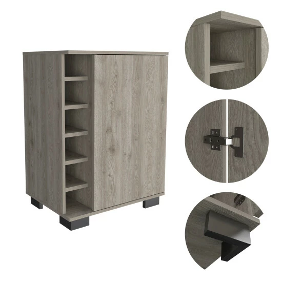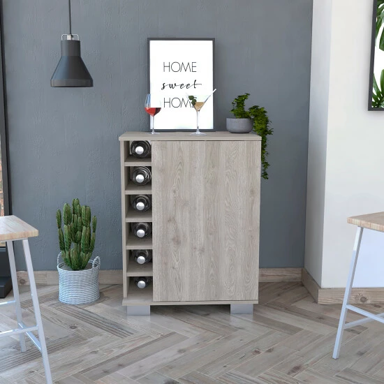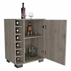The Liverpool Bar Cart share with your friends a drink will always be a pleasure. the perfect bar cabinet is waiting for you. It features a door cabinet with two internal shelves (each shelf: 10.1″ H x 2.4″ W) that will provide plenty of space to store your liquor bottles, glasses, or items that you need to entertain your guest, a six-bottle cubbies rack will provide you with the space you need to keep the wine bottles handy, top surface 30.4″. Designed with elegant light grey manufactured wood finish.