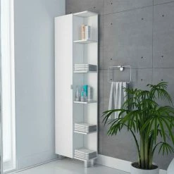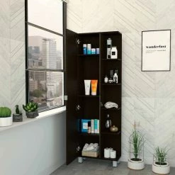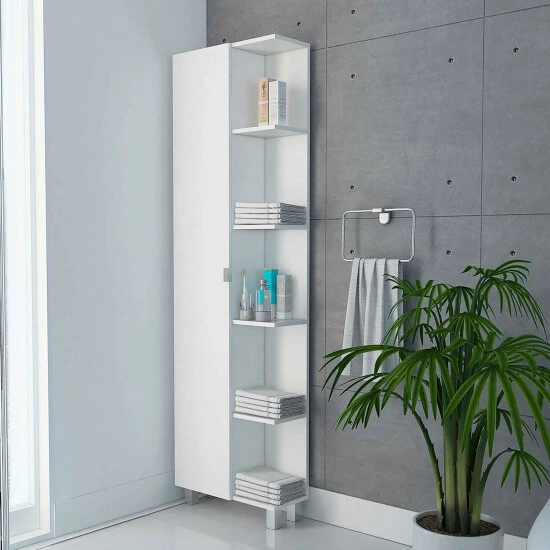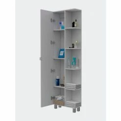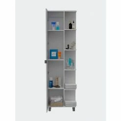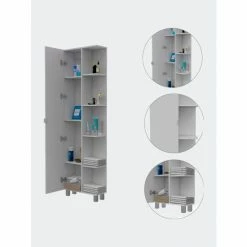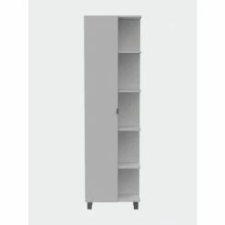 Los Angeles Corner Cabinet will provide you with that extra storage space perfect for storing your linens, towels, or toiletries. Featuring a 58″ high single door cabinet with three interior adjustable shelves. Also, five exterior shelves are perfect for displaying your decorative items. Four adjustable metal legs will give help you have a sturdy cabinet on any uneven floor. A wall installation kit is provided to avoid any type of tip-over accidents. Designed with elegant light gray manufactured wood finish.