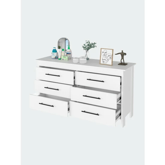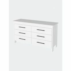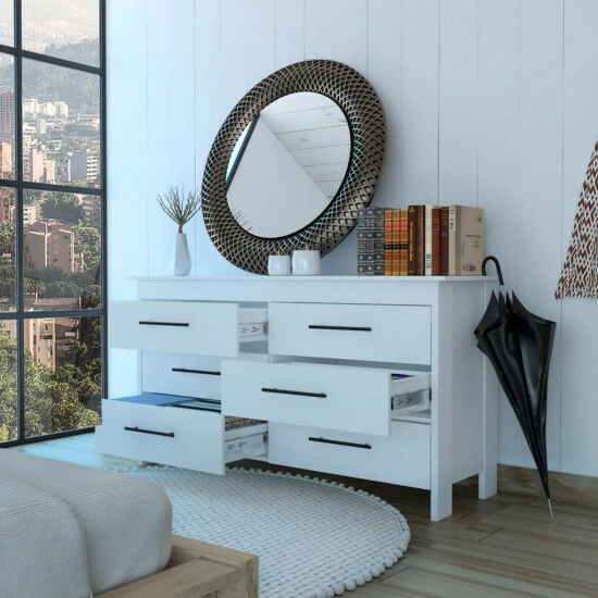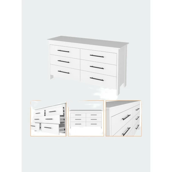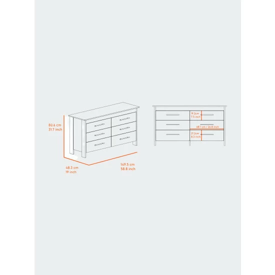 Luxor Six Drawer,this clean-lined double dresser brings your bedroom or guest room into the 21st century by offering virtual storage space. Made in Colombia, this economic piece features six very spacious drawers (7.5″ high x 26.8″ wide) that will provide you with plenty of hidden space; each drawer comes with black metal pulls, the top table (58″ W x 19″ D) is perfect for placing decorative items or even a flat-screen TV. This product stands on four legs with a 3.8″ clearance that will help you clean and reach underneath it. Designed with elegant black wengue and white manufactured wood finish.