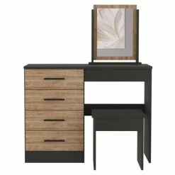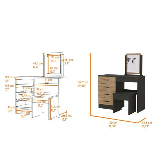 Merlot Makeup Dressing Table! This gorgeous piece is part of our new exclusive collection, and it’s sure to become a favorite in your home. This makeup dressing table is the perfect complement to any room. It includes an ample top surface (39,37”W x 16,73”D), mirror (19,4” H x 11,8” W), four drawers (13,1” D x 18,5” W x 3,9” H), and an incredible matching stool. Whether you use it for storing all your cosmetics or clothes, this dressing table will make your life easier. Designed with elegant Black Wengue, Black Wengue-Pine and Pine-White manufactured wood finish.