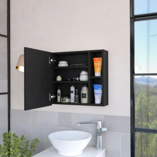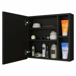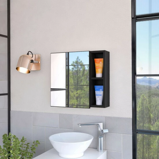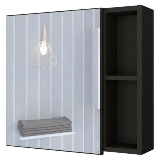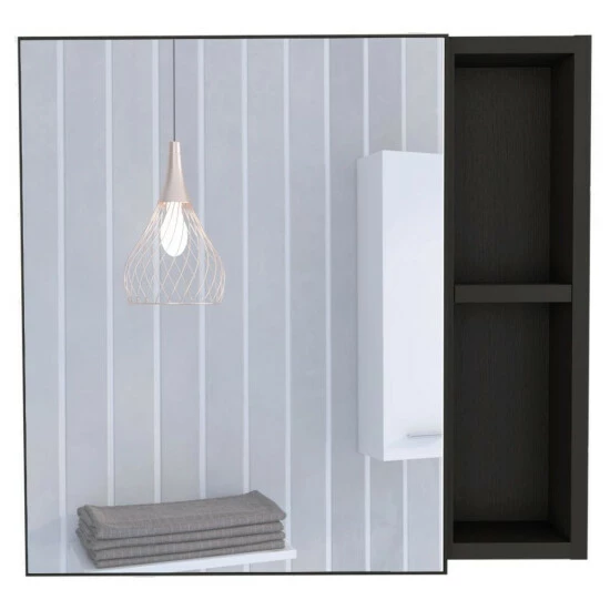 Minsk Medicine Cabinet, whoever said that you couldn’t have form and function in your bathroom? With the Minsk cabinet, you get both. This stylish and modern cabinet is perfect for adding extra storage to your bathroom without sacrificing any style. Plus, the unique design with black manufactured wood is sure to impress guests. Includes an ample mirror in the single door cabinet (13.7″ W x 18″ H), two external shelves (4.1″ W x 7.9″ H x 8.4″ H) and superior-top (20.4″). Designed with elegant black wengue, white, and light gray manufactured wood finish.