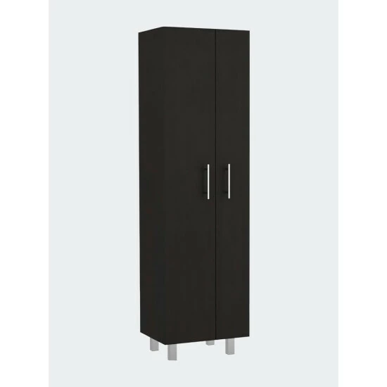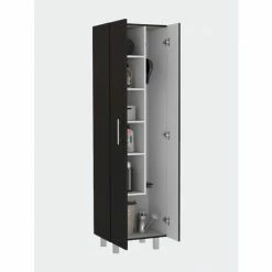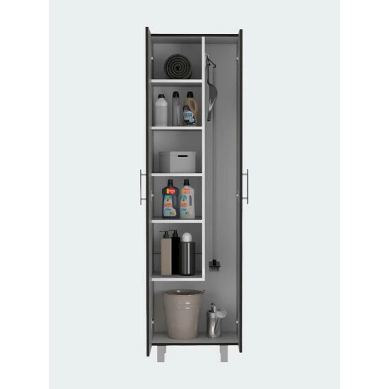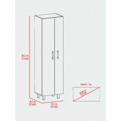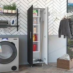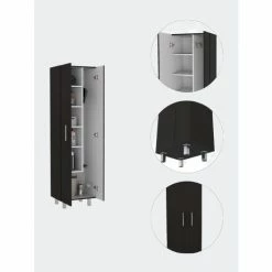 Norway broom closet pantry beautiful pantry, its modern style allows it to look nice anywhere. This beautiful pantry has five shelves (12″H x 11″W) to put everything you need, it also has ample space (7.3″W x 66.1″H) on the right side to store toiletries such as mop, broom, etc. Featuring a tall frame standing at 72″ high, you will find inside a broom and mope hanger tall enough also to fit a bucket and clothes. Designed with elegant black wengue-white manufactured wood finish.