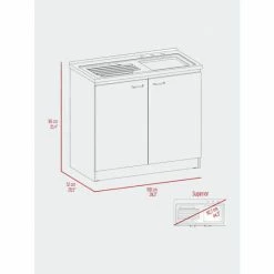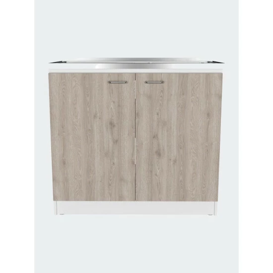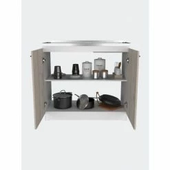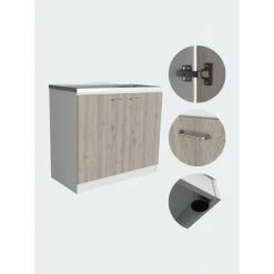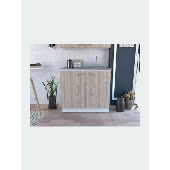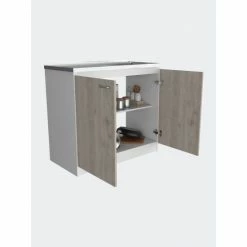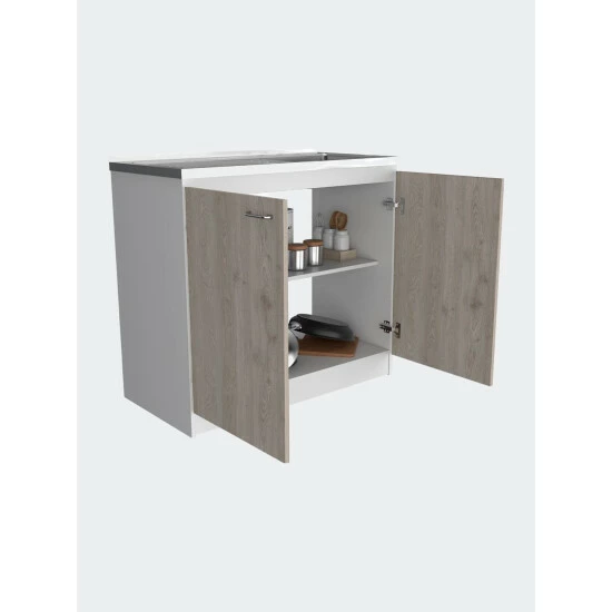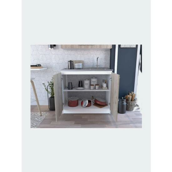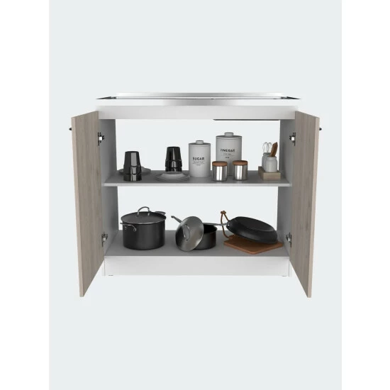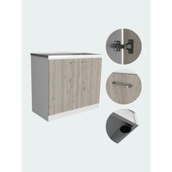 Oklahoma utility Sink. The vanity base strikes a rectangular silhouette, featuring a two-tiered shelving unit inside perfect for storing pots and pans or placing a basket of accessories, while two cabinet doors provide private storage for anything else you might need. Features an integrated steel sink. Complete the Oklahoma look with a matching Oklahoma wall cabinet. Designed with elegant white-light gray manufactured wood finish.