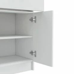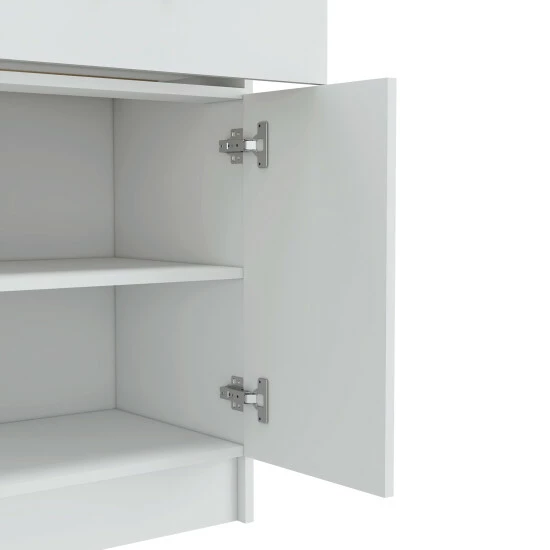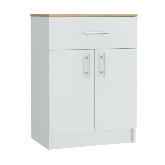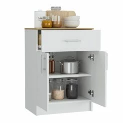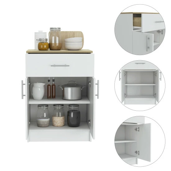 The Oxford Pantry Cabinet, this pantry has many features that will cover every need for extra storage in your kitchen, with plenty of compartments to store your everyday utensil and spices you may have and need. It features a countertop (23.6″ W x 19.9″ D), a drawer (20.01″ W x 15.9″ D X 7.8″ H), a two-door cabinet with two interior shelves (Upper 22.3″ W x 15.9″ D x 9.5″ H) (Lower 22.3″ W x 15.9″ D X 9.6″ H), internal hinges made of steel with a nickel-plated finish. Designed with elegant white / light oak manufactured wood finish.