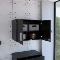 Penny Storage Wall Cabinet, keep your office looking tidy with this stylish Penny Wall Storage Cabinet. The perfect complement to the Penny Drawer Base, this cabinet provides ample storage space for all of your office supplies. Plus, the sleek white finish will brighten up any room. Includes padlock with key and ample two-door cabinet with three excellent internal shelves (26.33″W x 25.4″H x 7.87″H x 12.87″W) Designed with elegant Black Wengue manufactured wood finish.