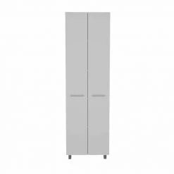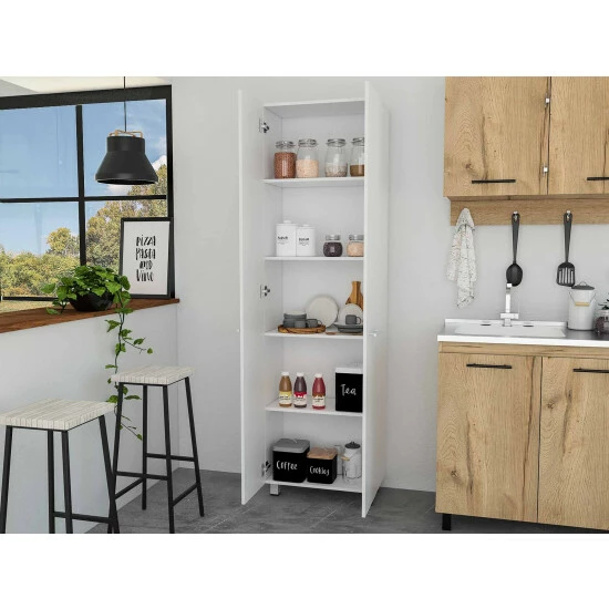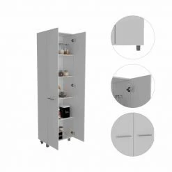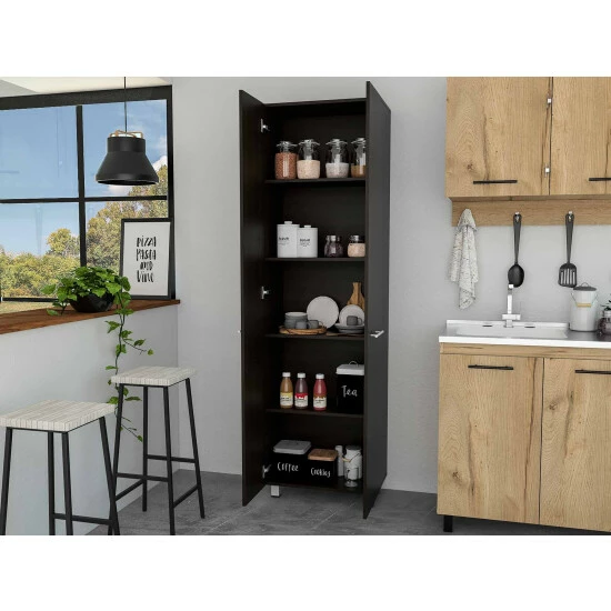 The Pensacola Double Door Pantry Cabinet A fantastic addition to your kitchen, this is a dream come through. Elegant and very functional, this pantry will allow you to expand your kitchen storage immensely and add a great look and style to your kitchen. It features a 78″ high storage cabinet with loads of storage space, a versatile unit that can complement any room in the house, and five spacious 14.5″ high interior shelves 14.5″ high x 23.3″ W that will help you store everything from pots, pans, utensils, jars, spices, or dishes, metal door handles. Designed with elegant Black Wengue, White manufactured Wood finish.