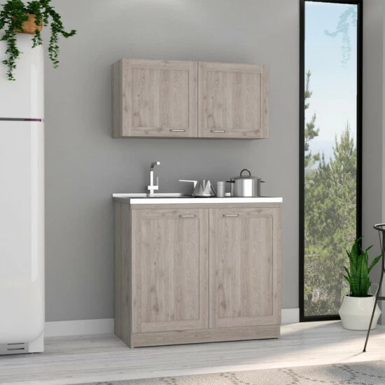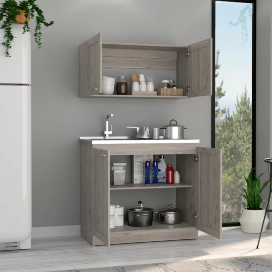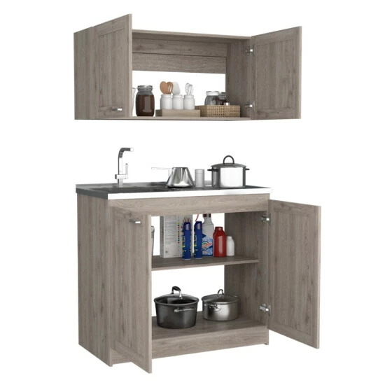 If you want an ideal kitchen, it requires the incorporation of a Cabinet Set, and we have the proper one for you.This Perseus Cabinet set features plenty of storage and plenty of storage for the whole of your kitchen necessities, with a double set for superior and lower cabinets. This set comes with two interior shelves for organizing your utensils and two-door cabinets for a unique look.Its dimensions are (30.8″ H x 39.3″ W x 20.4″ D) and (19.2″ H x 39.3″ W x 12.6″ D), the superior top (41.2″) the low top (44.3″)in light grey particleboard.