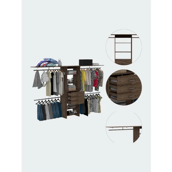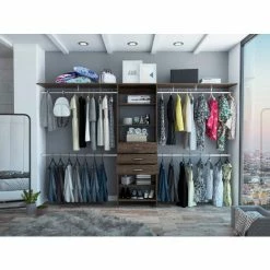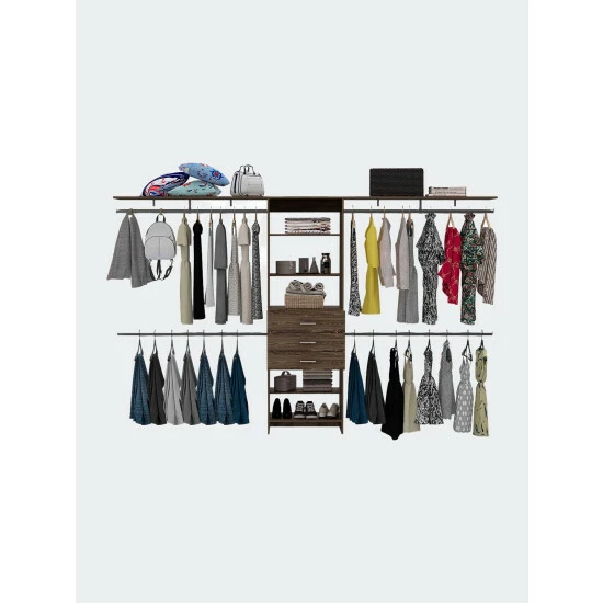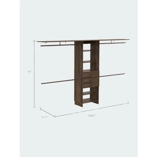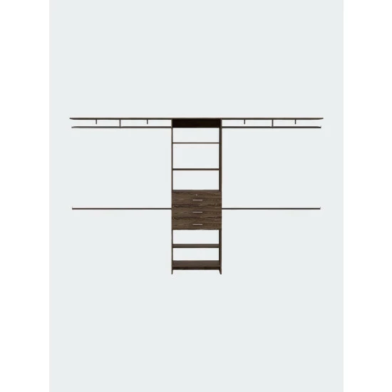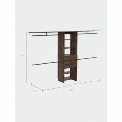 Pittsburg Drawer Closet, its a unique and complete closet system will bring life to your closet. Forget about those ugly wired systems with plastic rods; bring style to every space of your bedroom and add the functionality you need to put your clothes in the perfect room. This system can cover up to 118″ wide of space with its two top shelves that can be removed as you see fit. Also, a center shelving system that includes five shelves, three very spacious drawers, and four hanging rods will ultimately set you up. Give your closet a fresh, stylish look with this excellent closet system. Designed with elegant dark walnut manufactured wood finish.