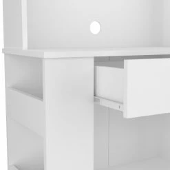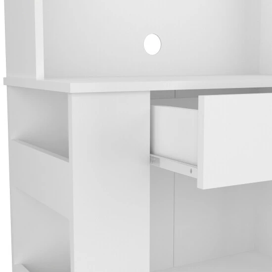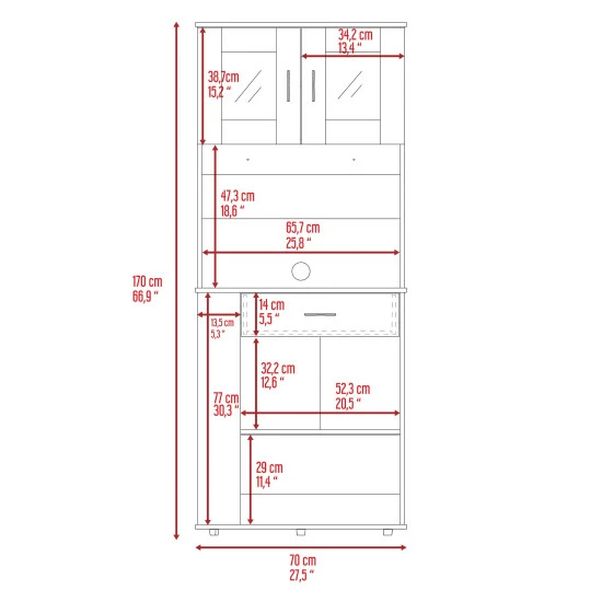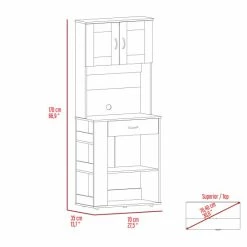 The Poole Pantry Cabinet organization station frees up valuable countertop and cabinet space, optimizing your kitchen space and making your day-to-day life a more practical and perfectly sized multifunctional pantry. It features two open shelves (lower 20.5″ width X 13.5″ depth X 11.4″ height) (Upper 20.5″ W x 13.7″ D x 12.6″ H), a drawer (20.5″ W x 13.5″ D x 5.5″ H), three side open shelves (13.5″ W x 5.3″ D x 10.1″ H) each one, microwave countertop (25.8″ W x 13.5″ D) and four adjustable metal legs for an excellent balance and stability. Designed with elegant White manufactured wood finish.
