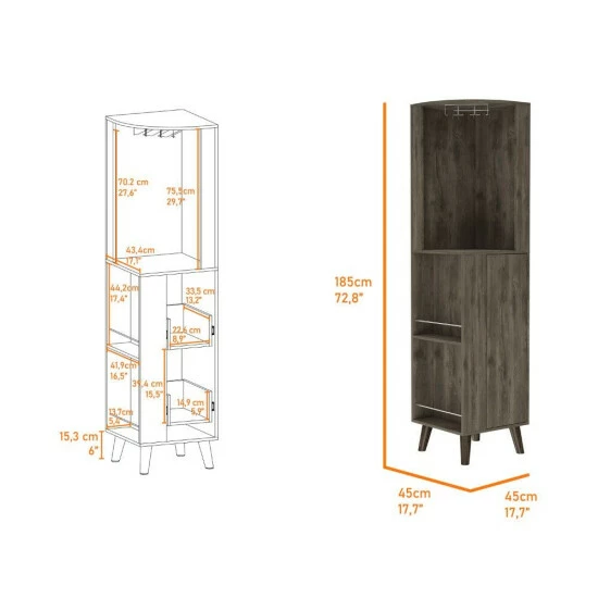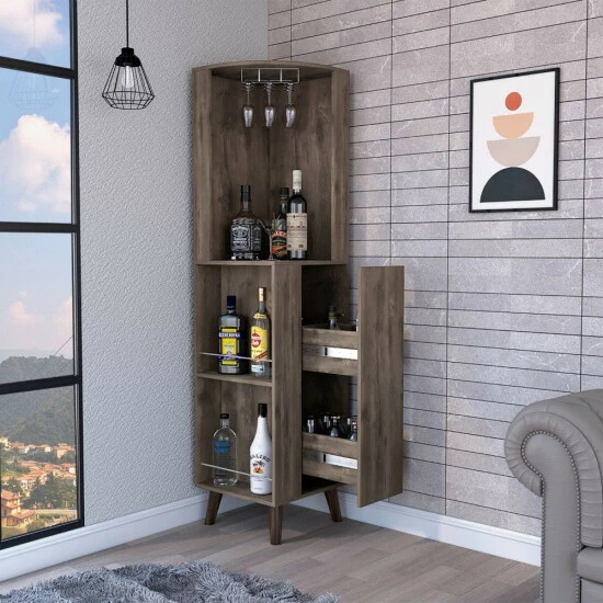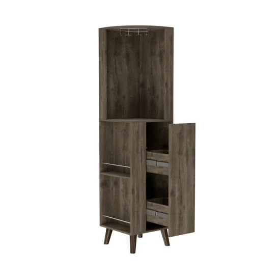 Quinn Corner Bar Cabinet, add some character to your corner with Quinn. This bar is designed to fit in any tight spot, and its large capacity means you can store all of your supplies with an ample superior shelf, one ample drawer with two shelves, includes a cup rack for your glasses! With a sleek design and witty name, Quinn will make your corner the life of the party. Designed with elegant dark Brown manufactured wood finish.