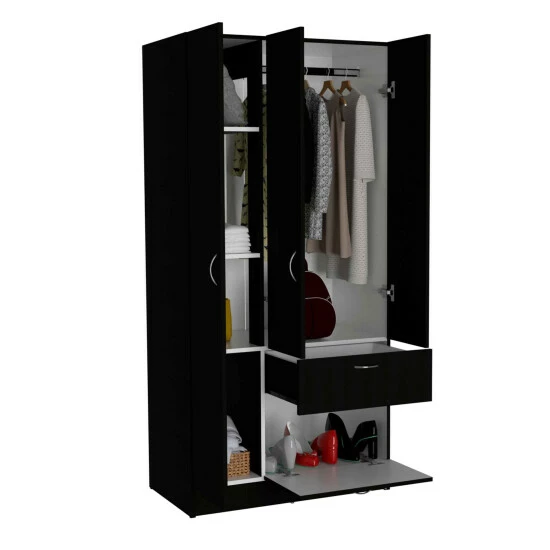 Ramblas Armoire, compose an organized clothing storage arrangement with this Ramblas three-door armoire with a ton of features, such as: A two-door cabinet 42.9″ high with a slick hanging rod will allow you to hang your shirts, suits, pants, or dresses and provide enough space to use the bottom part as a shelf, one spacious drawer at the bottom is the perfect place for smaller items that you need handy. A 67.2″ Height will allow plenty of space to store all kinds of clothing items. A small pull-down door at the bottom opens up cabinet space for you,on the left features a one-door cabinet with three shelves that will give you four spacious compartments to put your shoes, hats, shirts, and all your foldable clothing.Designed with elegant black wengue manufactured wood finish.
