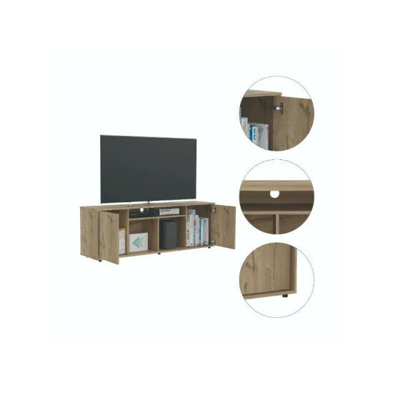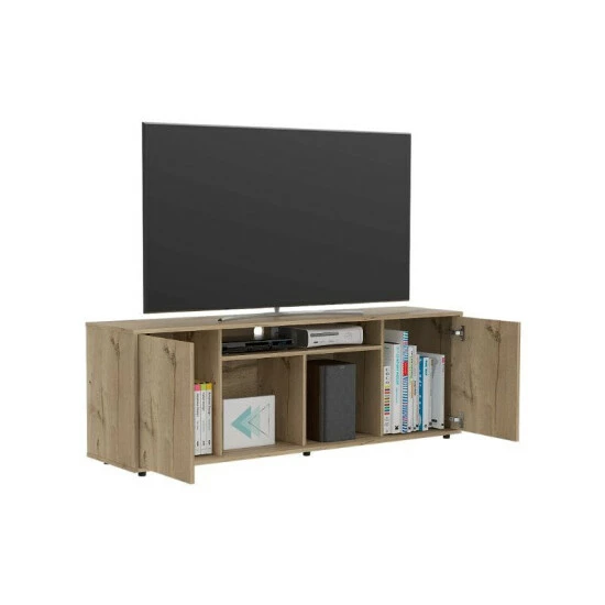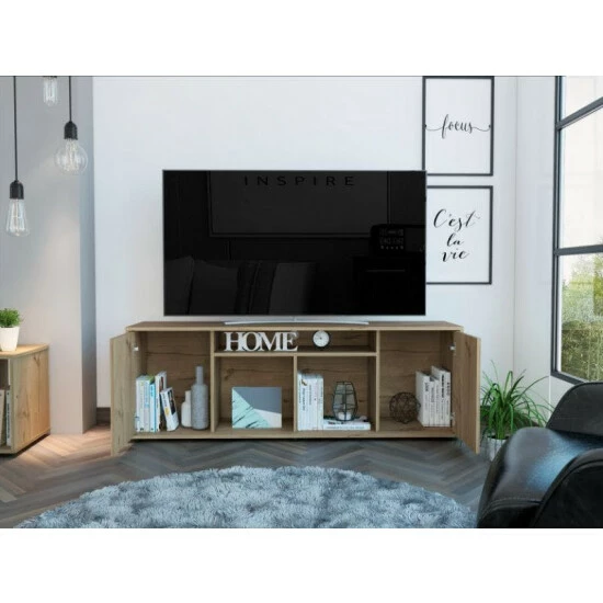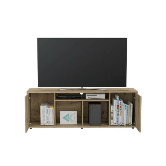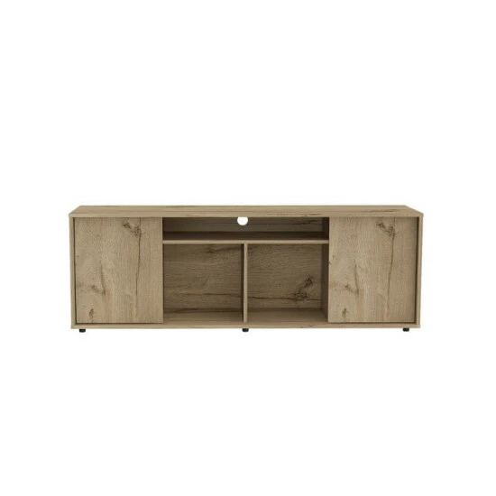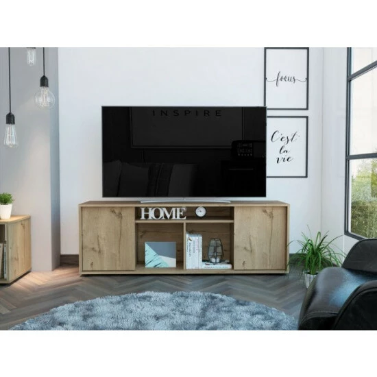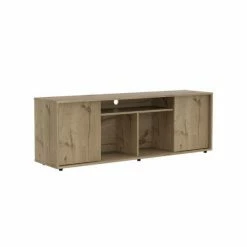 The Redding TV Stand With Laminate is a multifunctional piece of furniture that you can place in your living room or bedroom and make it look modern because of its design. It features a modern design with functional storage options, a sturdy design that can accommodate up to 65″ TVs, three center shelves provide open storage options or decor space and two-door panels provide private storage for your electronic components. Designed with elegant black wengue and light oak manufactured wood finish.
