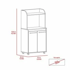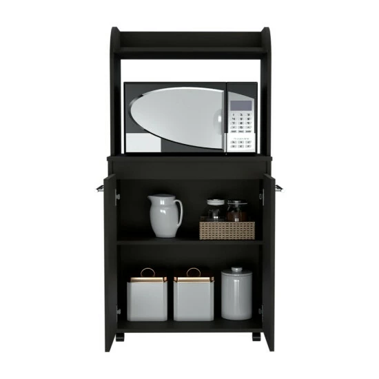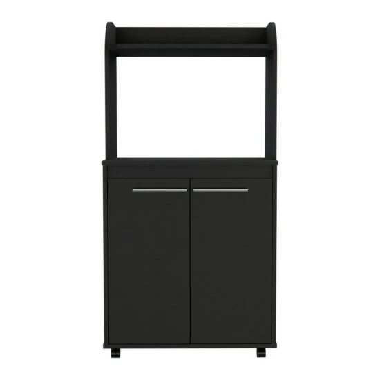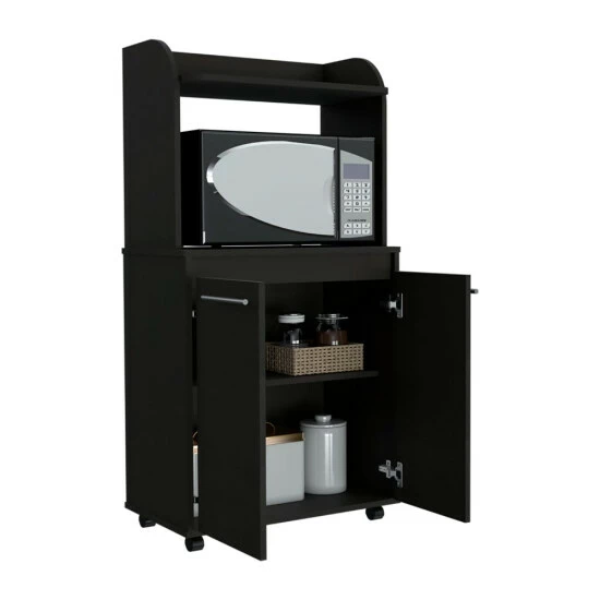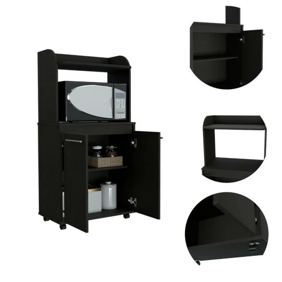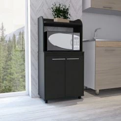 The Rockford Kitchen Cart is perfect for anyone who wants to add a little more convenience and mobility to their kitchen. With four caster wheels (1.77″), this cart can be easily moved around the kitchen, and the shelf designed specifically for your microwave (15.70″ H x 23.34″ W) means that you’ll never have to worry about where to put it again. Includes a two-door cabinet with two internal shelves (11.49″ W x 10.51″ H), as well as a large countertop. Designed with elegant black wengue and white manufactured wood finish.