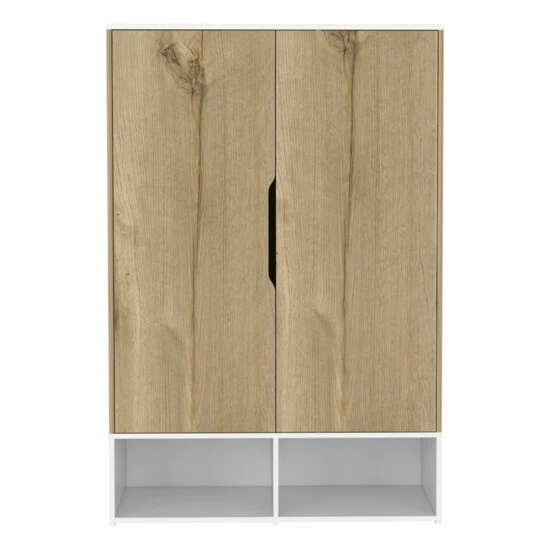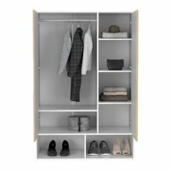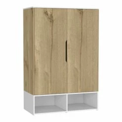 Rose Armoire becomes irresistible! Need more storage? Easy to assemble with all hardware made in metal, numbered, and separated, it might be a fun family project putting it together. Its size is perfect to fit most rooms, providing a lot of closet space without taking up much of your room. Two spacious, extensive open shelves (18.7″ W x 9.4″ H) are perfect for use as a shoe rack. A Double Door cabinet with an interior hanging rod and four Interior shelves to store folded clothes. Designed with elegant light oak-white and black wengue-light oak manufactured wood finish.