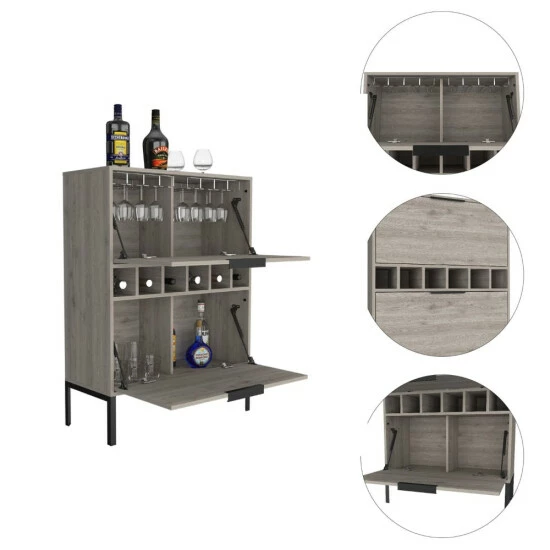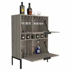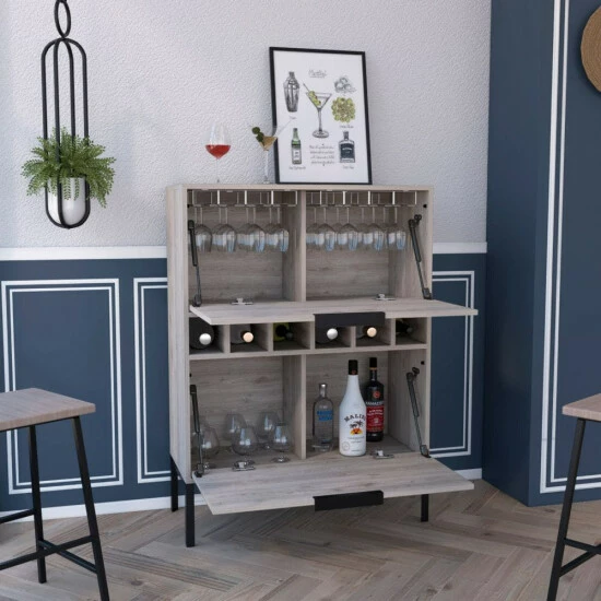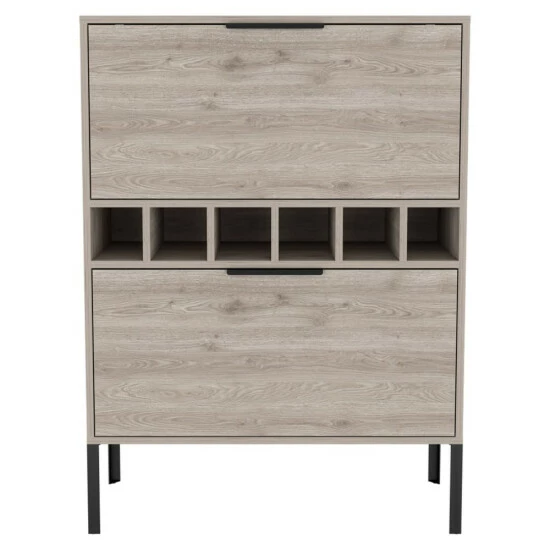Rowan Bar Cabinet, if you enjoy wine and cocktails, this bar is an incredible choice for your new home bar, with six wine cubbies (4.4″ H x 4.6″ W) that preserve your wine and your glasses. With its stylish steel legs and light grey manufactured wood, its dimensions are ideal for a modern touch with elegant steel legs(7.8″ H x 31.4″ W), Includes two flexible drawers and a countertop to mix your favorite cocktails. Designed with elegant light grey manufactured wood finish.