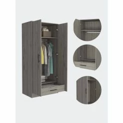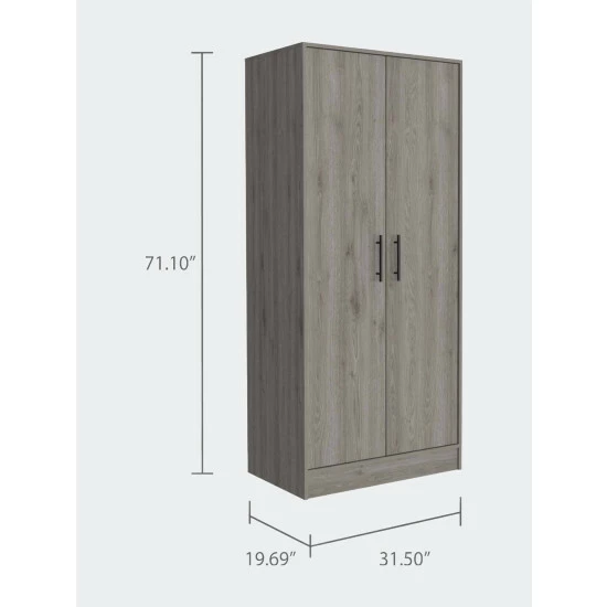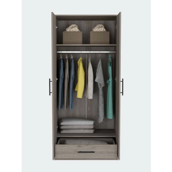 San Blas Double Doors Armoire, can’t decide what you’re planning to store in your bedroom? The San Blas 2 Door Armoire, is versatile enough to accommodate just about anything you choose! Insert the adjustable shelf or as well. Featuring two doors concealing all your items, use a hanging rod to store clothes; inside, you will find plenty of room on a top shelf to keep blankets, sheets, and pillows nearby (13.4″ H x 31.4″ W). Mix that with a bottom shelf for the perfect space to squeeze in more storage. Last, a huge drawer (4.9″ H ) is the final touch to get all the storage space you may need. Designed with elegant light gray manufactured wood finish.