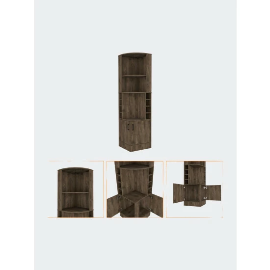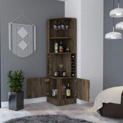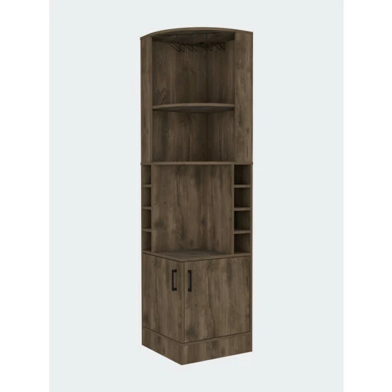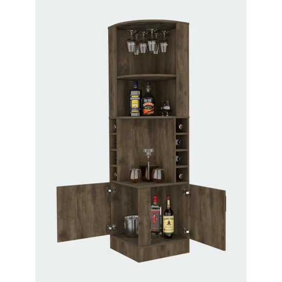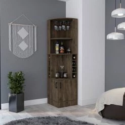The Seattle Bar Cabinet this spacious bar cabinet, with an impeccable design and easy to fit in any space, is perfect for arranging in any of the social places of your home and giving it a different atmosphere. It features two-door bottom cabinet (17.0″ H x 17.1″ W), 8 cubbies for liquor or wine (each cubie: 4.4″ H x 4.4″ W), middle display area for highlighted liquor items (17.6″ H x 12.7″ W), one upper shelf (11.9″ H x 17.1″ W). Designed with elegant smokey oak, white, black wengue, dark walnut, light grey and macadamia manufactured wood finish.