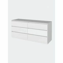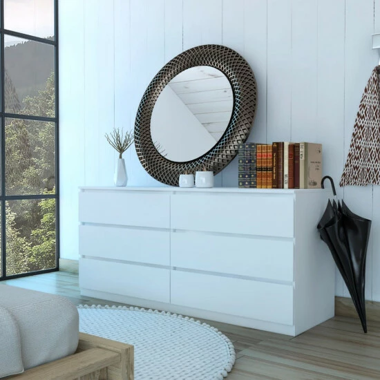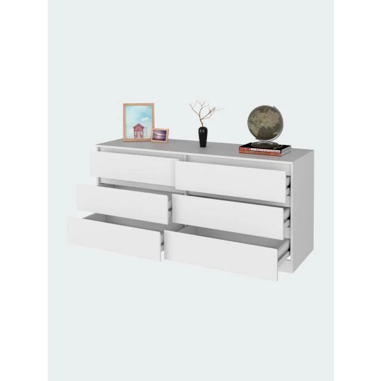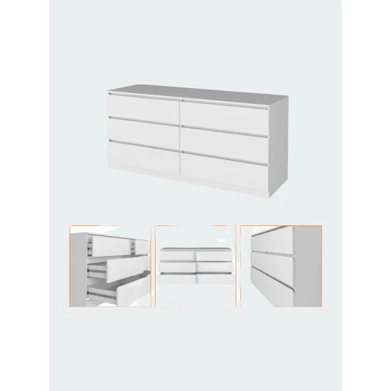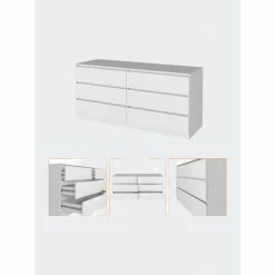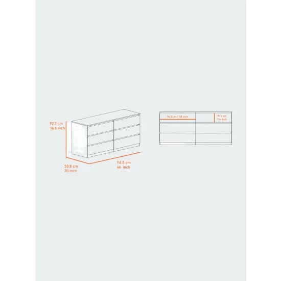The Seul 6-Drawer Chest adds contemporary flair to your bedroom. Thanks to its six spacious and efficient drawers, they offer an excellent solution for storing accessories. Sturdy and an easy-to-clean foil surface, the Seul dresser will be a productive and durable piece in your collection. This dresser features six very spacious drawers (7.4″ H x 29.8″ x 18″ D) with all-metal rails for smoother use and more excellent quality. A spacious top surface (60.4″ W x 19.6″ D).This product comes with a wall anchor kit included in the box to prevent tip-over of the product. Designed with elegant black and elegant light oak-white manufactured wood finish.