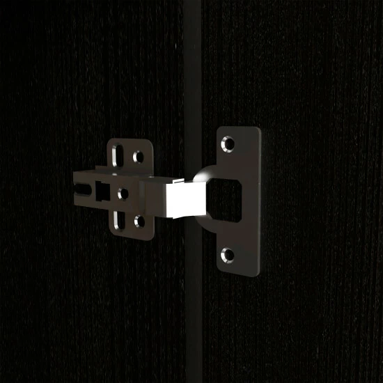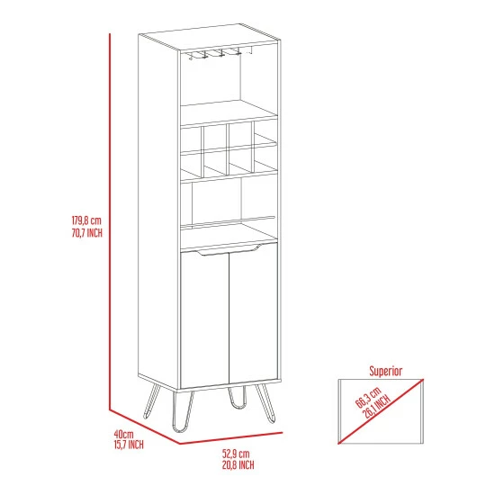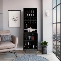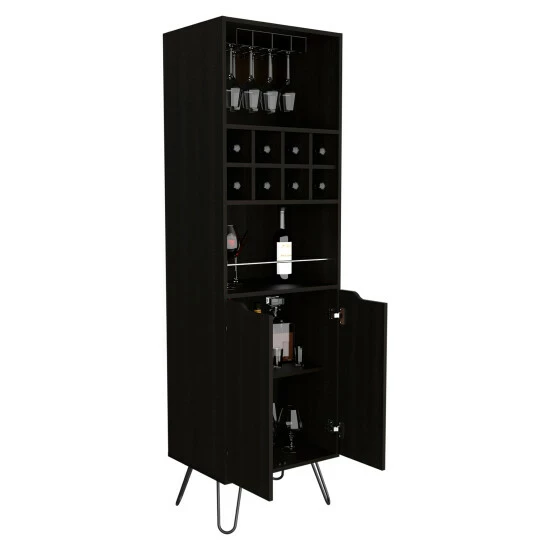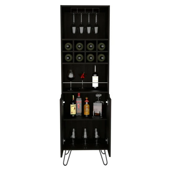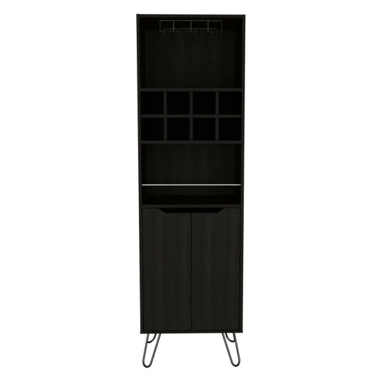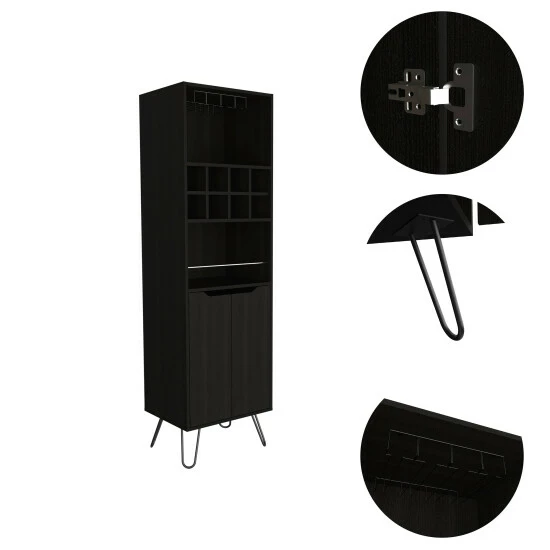 The Sheffield H Bar Cabinet this spacious bar cabinet, with an impeccable design and easy to fit in any space, is perfect for arranging in any of the social places of your home and giving it a different atmosphere. It features a door cabinet with two interior shelves, 8 uncovered shelves for liquor or wine, and 4 steel light legs, easy to assemble. Designed with elegant Black Wengue manufactured wood finish.