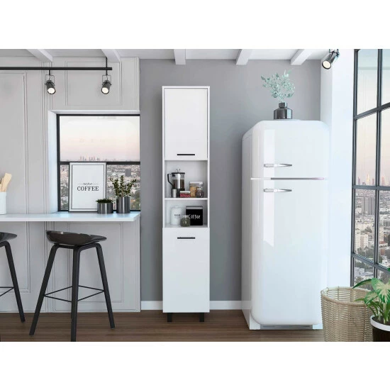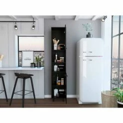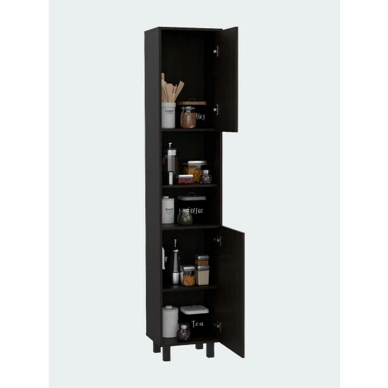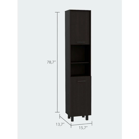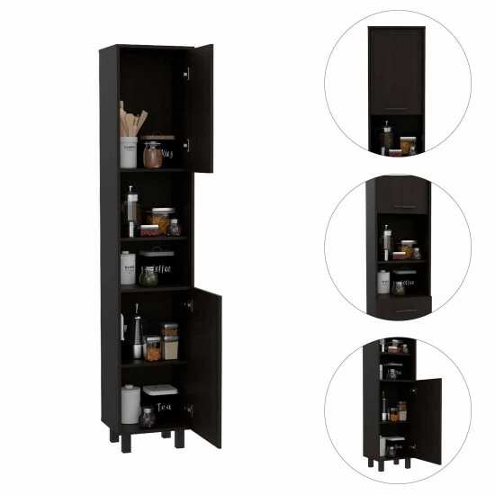 The Sheffield Pantry Cabinet perfect for small spaces, with an ergonomic, modern, and contemporary design, is ideally suited to your needs to store many kitchen accessories in minimal space. Thanks to its great height, you can store what is necessary to keep a kitchen in good condition, and free of clutter. It features a 78″ high pantry, two open shelves, a bottom cabinet with two interior shelves, top cabinet with 23″ H x 13.7″ x 15.5″ dimensions. Designed with elegant Black Wengue, White manufactured wood finish.