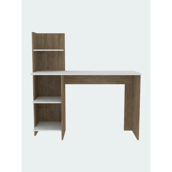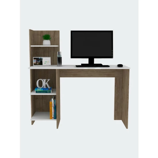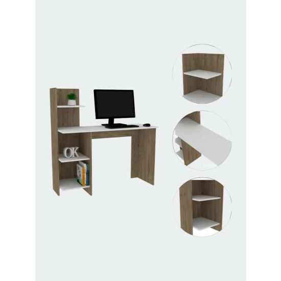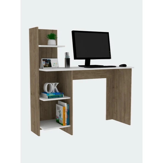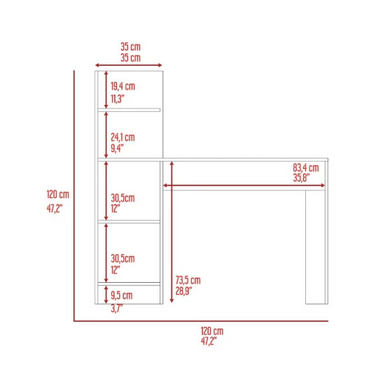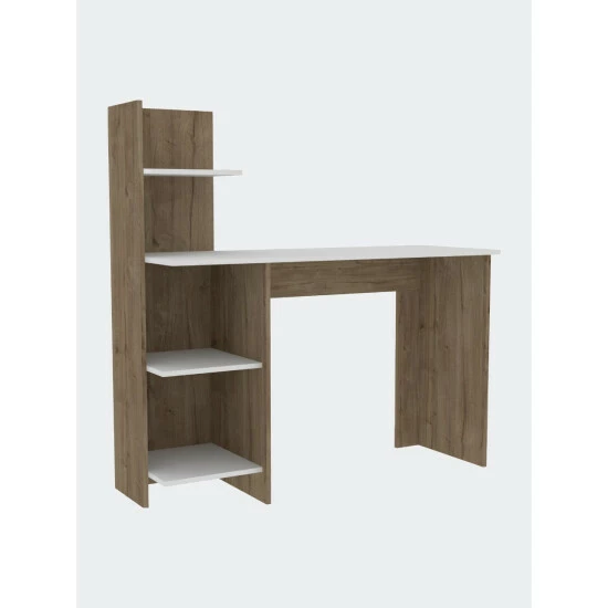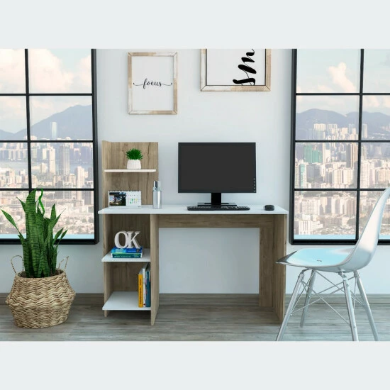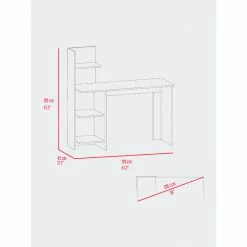Tecoa Desk, this beautiful office desk, different, original, break the limits of design with its sizeable abstract structure.Easy to use, easy to assemble, and very resistant. A top surface of 47.2 inches wide and 17.7 Inches deep will allow you to have a laptop or monitor plus the right amount of space for keyboards and a mouse. The two shelves on the bottom left side are excellent (12″ H x 13″ w) to store your more important items; a small hutch on the left side has two shelves more. The legroom space is 28.5″H. Designed with elegant smokey oak and white-pine manufactured wood finish.