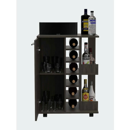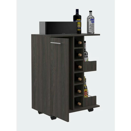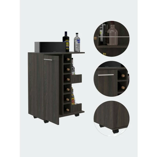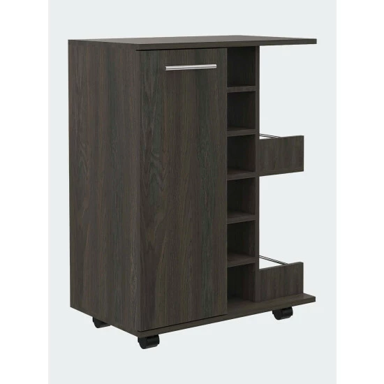The Tennessee Bar Cart this highly versatile service cart can easily fit into any room in your house, especially your kitchen and living room. Perfect for entertainment and storing anything you need to move from one room to the next. It features one enclosed cabinet on the left with two interior shelves (the entire cabinet: 28.7″ Height x 11″ Width), two open bottle shelves with rail guard and wooden, six open bottle cubbies: 4.2″ Height x 5.5″ Width; the bottom one: 4.5″ Height x 5.5.” Width, lockable and removable 2.2″ height casters. Designed with elegant black wengue, smokey oak, white, light oak, carbon espresso, dark walnut, light oak manufactured wood finish.