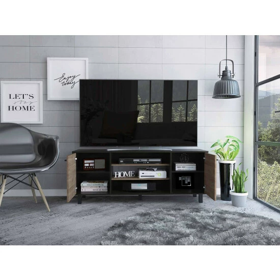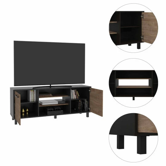 The Washington TV Stand is ultra-spacious, practical, and polished in its design, offer a comprehensive solution for anyone who desires oversize furniture, and is efficient to save all types of accessories; this great piece of furniture reflects a minimalist and straightforward style that creates a connection with any exterior design and decoration; also, it’s a piece of furniture that fits anywhere, living room, bedroom or office. It features a top surface (58.6″ width) that can hold a 65″ flat-screen TV, two cabinets with two interior shelves: each shelf and cabinet door, three shelves (one open shelf and two semi-open shelves), and reinforced squared metallic legs (x4). Designed with elegant carbon espresso manufactured wood finish.