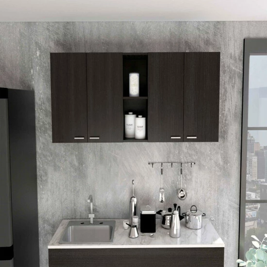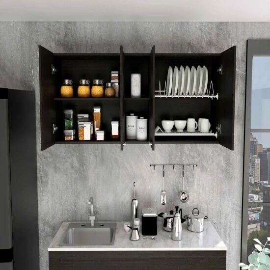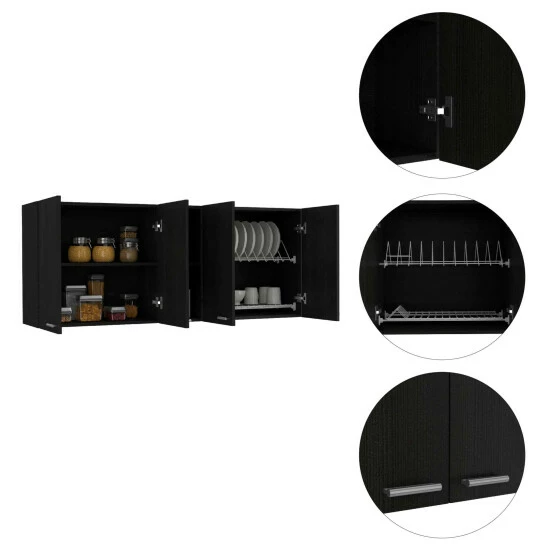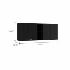 The Winslow 59” Wall Cabinet If your kitchen needs extra storage, then look no further. This product will solve your kitchen storage issues while giving you a look that will be admired by your guests. It features a modern design in harmony with functionality and comes with four-door panels with metal handles, a built-in dish rack and holder, and two open center shelves for storage or display. Designed with elegant Black Wengue, White manufactured wood finish.Dimensions :Height: 23,6” • Width: 47,2” • Depth: 13,1”Furniture Type: Ready to assemble (full assembly required)Certifications: CARB phase II compliant – TSCA Title VI CompliantWarranty : 1-year warranty coverage in wooden parts- 1-year warranty coverage in hardware pieces since its manufacturing date found in the lot number printed in the product boxShipment details: Free shipping to the 48 contiguous states – delivery time: Between 2 and 14 days depending on the customer’s location, season, and weather factors.Other details: This product does not include decorative or background elements; Check that the box is in good condition, and well packed, and check with the help of the manual that the corresponding parts have been included; For more information regarding warranty, shipment details, cancellations, returns & replacement parts go to the bottom section of our website to learn more; Installation & Assembly Instructions included.